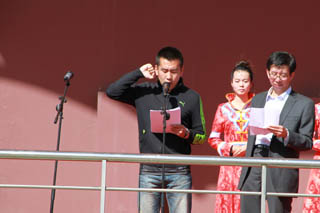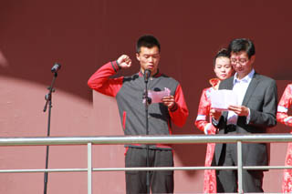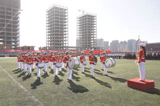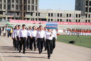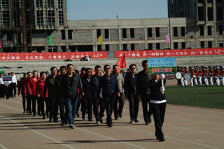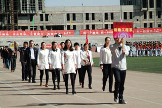 開幕式由黨政辦公室主任胡利春主持,在雄壯高昂的運動員進(jìn)行曲中,各系學(xué)生和教工方隊,機關(guān)、教輔單位職工方隊,步伐矯健,口號響亮,依次走過主席臺接受檢閱。隆重的入場式后,開幕式舉行了莊嚴(yán)的升國旗儀式,在嘹亮的國歌聲中,五星紅旗冉冉升起。