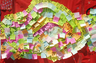 活動(dòng)現(xiàn)場(chǎng)氣氛活躍愛(ài)意濃濃,參加活動(dòng)的同學(xué)首先寫出祝福母親的話語(yǔ),并由工作人員帶領(lǐng),粘貼在展板上;工作人員還為同學(xué)們提供了一個(gè)錄制視頻表達(dá)感恩的平臺(tái),說(shuō)出想對(duì)母親說(shuō)的話。一張張小小的貼紙上寫滿了對(duì)母親真誠(chéng)的祝福,真心祝福每一位母親健康快樂(lè)!