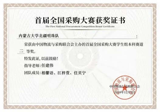 2024年12月1-2日,中國物流與采購聯(lián)合會主辦,深圳交易集團有限公司和中國石油物資有限公司承辦,深圳交易研究院有限公司和北京物資學(xué)院共同協(xié)辦的首屆全國采購大賽決賽及頒獎典禮在深圳舉行。由我院運輸工程系任建偉教授指導(dǎo),相馨語(物流2202班)、江梓萱(物流2202班)、任貝寧(物流2202班)組成的“北疆明珠隊”榮獲全國二等獎。